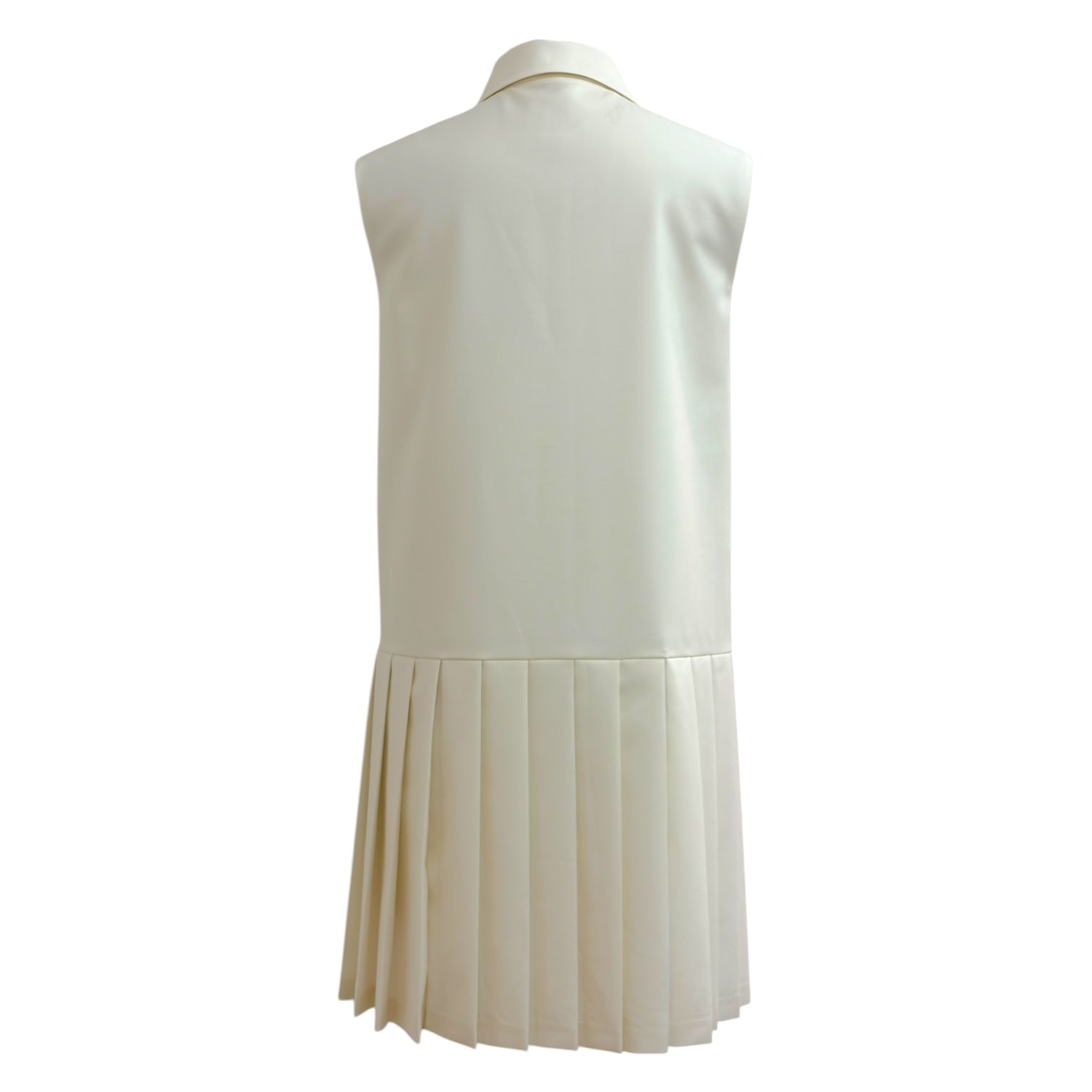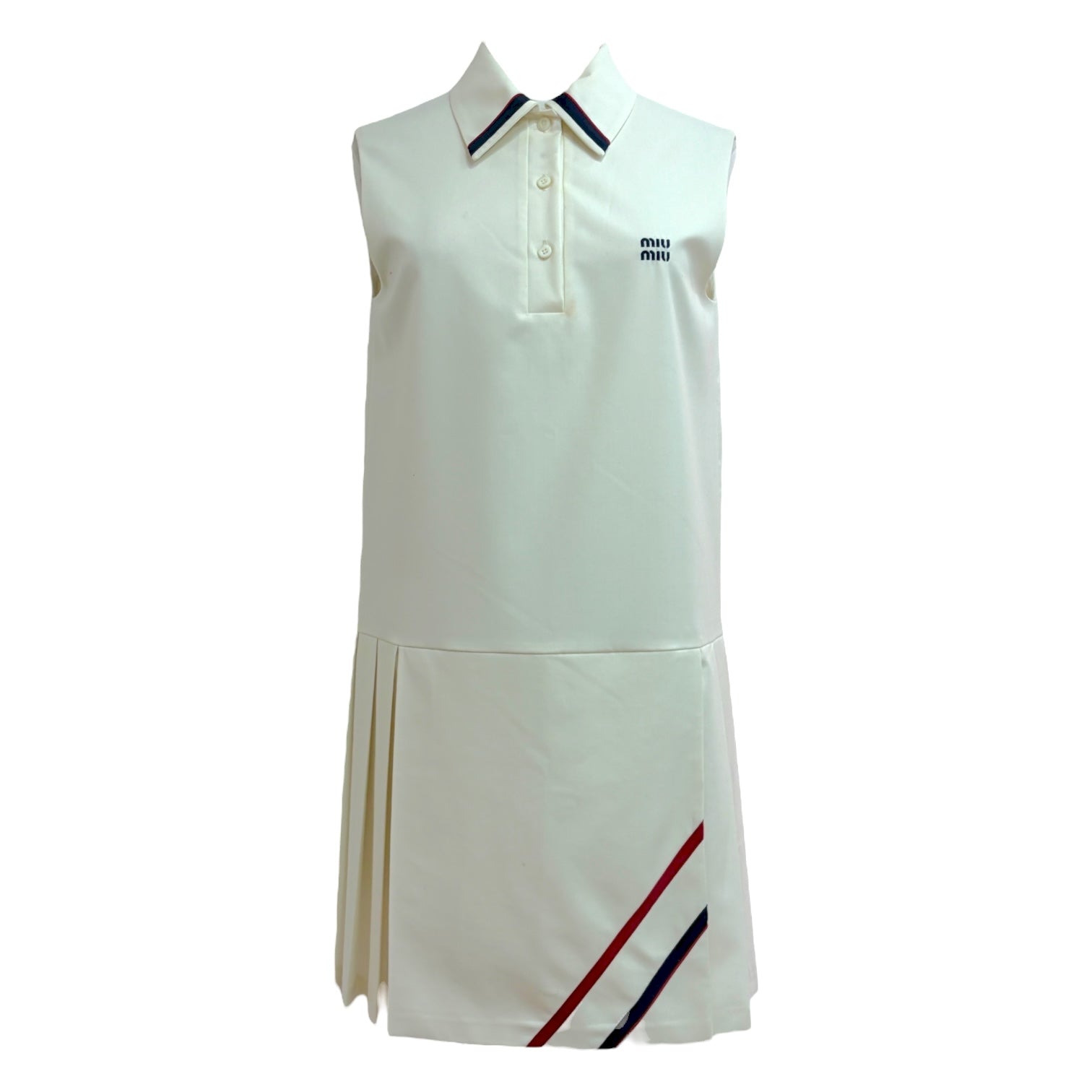 This Miu Miu white sleeveless polo dress captures the brand’s playful take on sporty elegance. Crafted from soft, structured cotton, it features a classic polo collar with navy and red striped trim and a three-button placket for a refined finish. The brand’s embroidered logo adorns the chest, while the skirt reveals a dynamic pleated design and diagonal stripe accents in matching tones. Effortlessly blending preppy charm and youthful sophistication, this dress is perfect for both casual days and polished summer occasions.