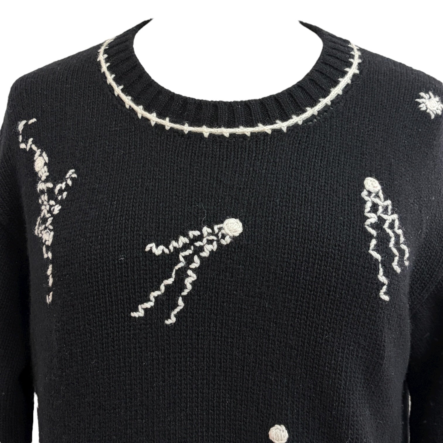 A striking Prada black wool sweater adorned with playful white embroidered star motifs, blending dark whimsy with artisanal craftsmanship. Finished with contrast hand-stitched detailing along the collar and hem, this piece channels Prada’s signature mix of intellect and irreverence — a collectible knit for lovers of avant-garde luxury.