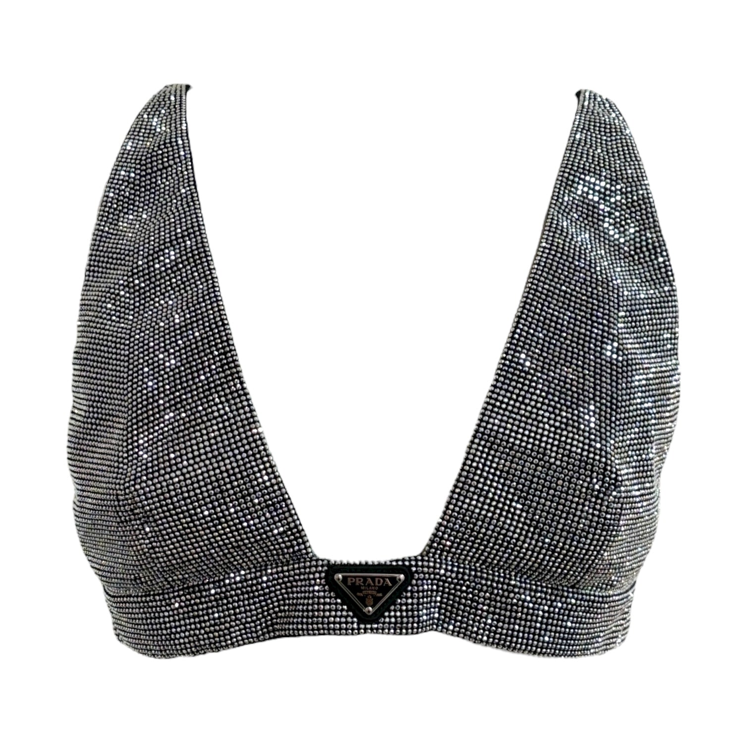 This dazzling Prada bralette is adorned with all-over crystal embellishments, showcasing the brand’s signature triangle logo at the center. Featuring a deep V-neckline and structured design, it exudes modern glamour with a bold, luxurious edge — perfect for statement layering or evening allure.