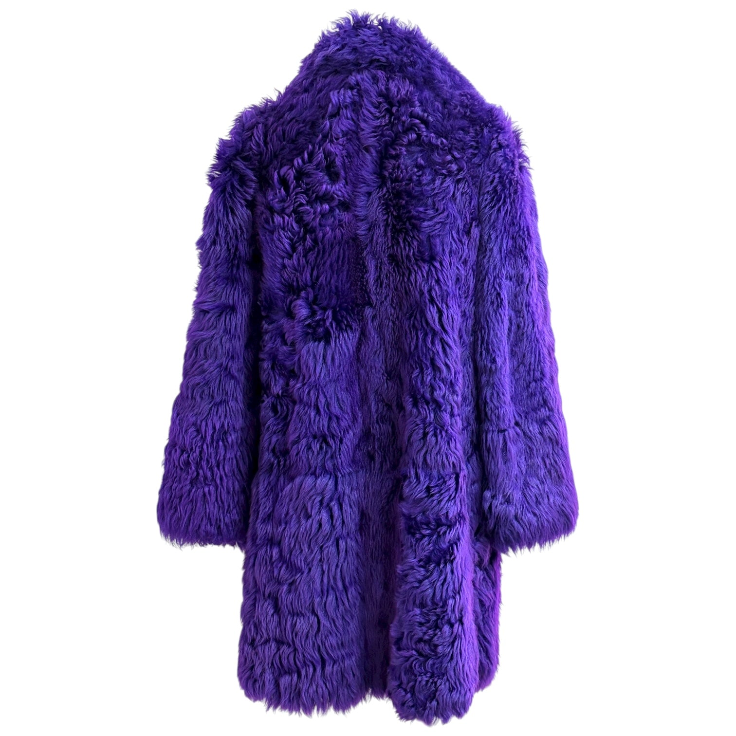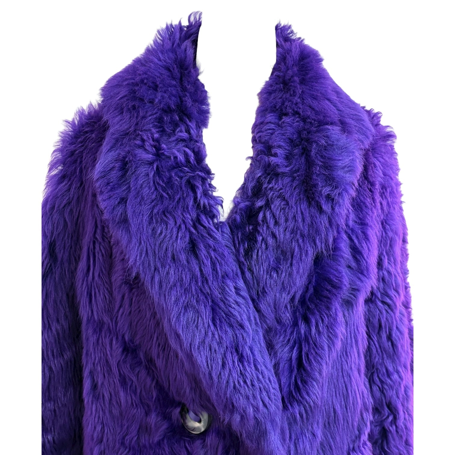 This striking Fendi purple lamb fur coat embodies bold luxury and contemporary elegance. Crafted from plush, high-pile faux fur, it features contrasting smooth leather pockets detailed with Fendi’s signature woven motif. The oversized silhouette and deep lapel collar add dramatic volume and warmth, while the vivid violet hue makes a statement of modern sophistication. A standout piece that captures Fendi’s mastery of texture and Italian craftsmanship.