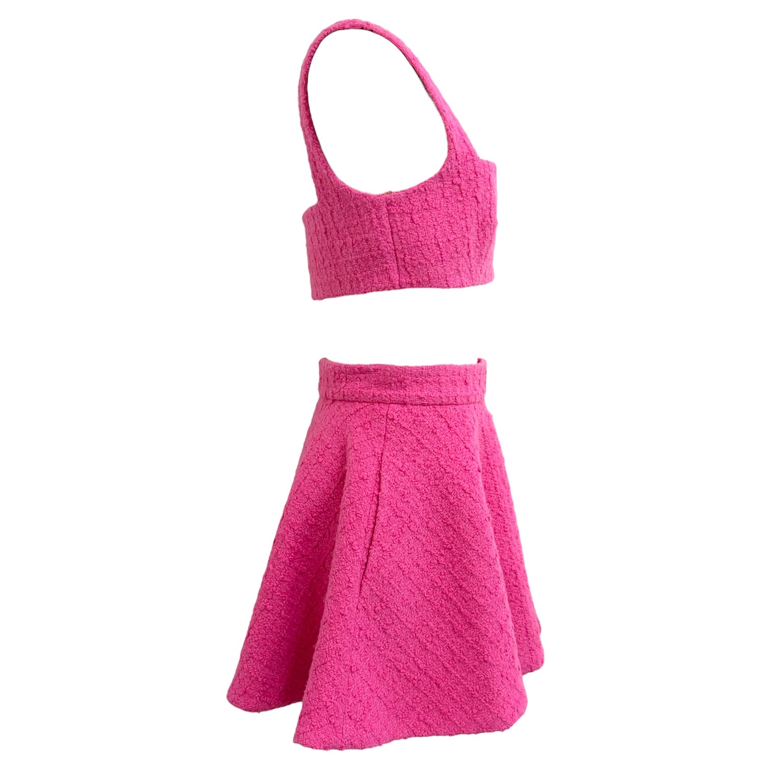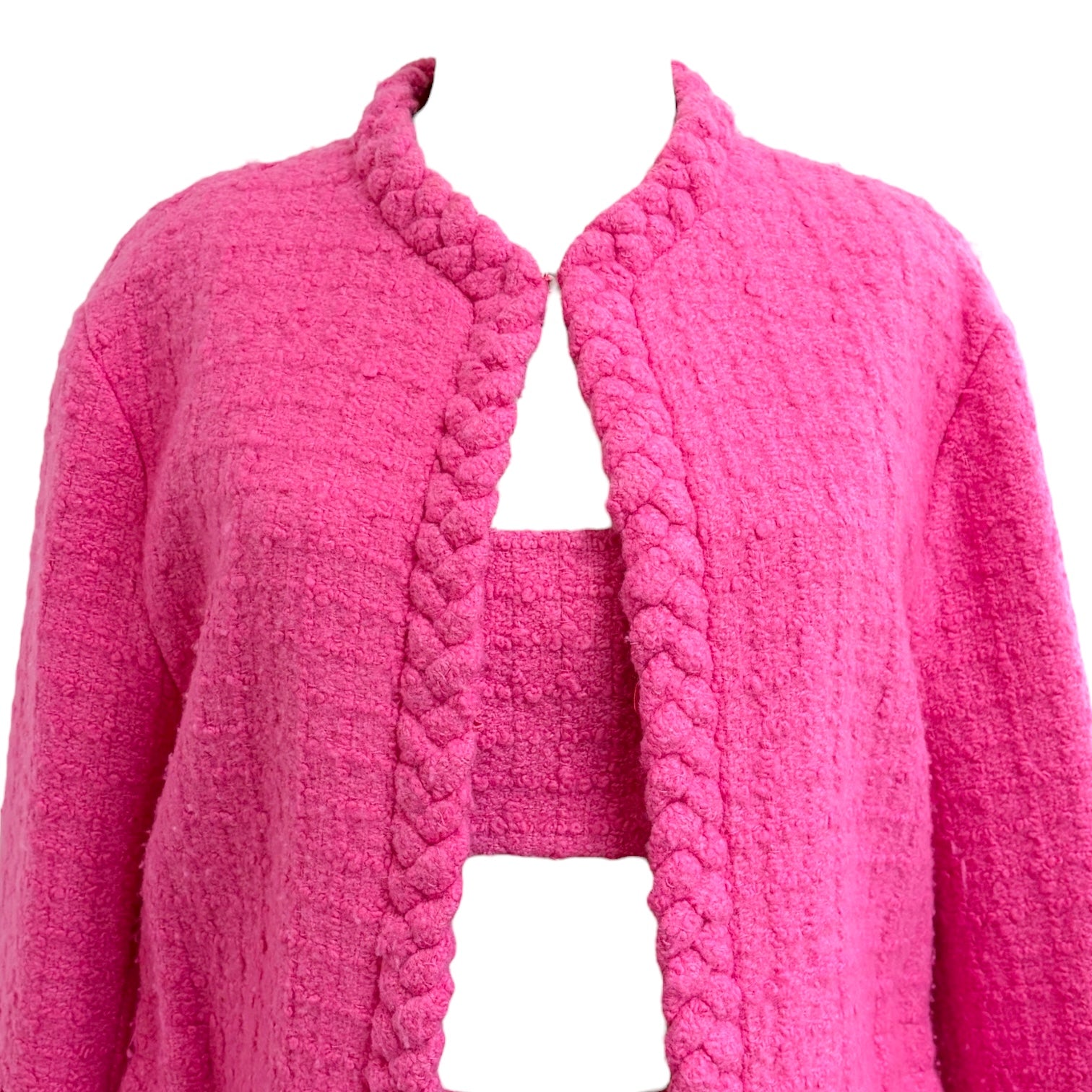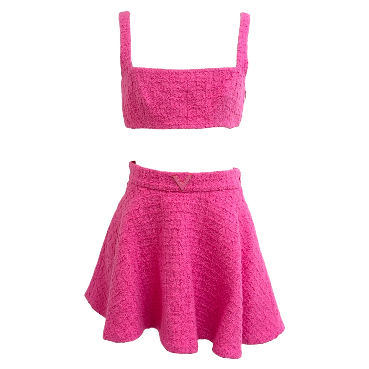 A statement Valentino three-piece set in vibrant pink bouclé knit, featuring a long open-front cardigan, matching crop top, and mini skirt. The jacket is detailed with braided trim and front patch pockets adorned with signature Valentino metal stud accents. The coordinated crop top and skirt complete the look with a modern, feminine edge — ideal for a chic monochrome ensemble that blends luxury craftsmanship with youthful boldness.