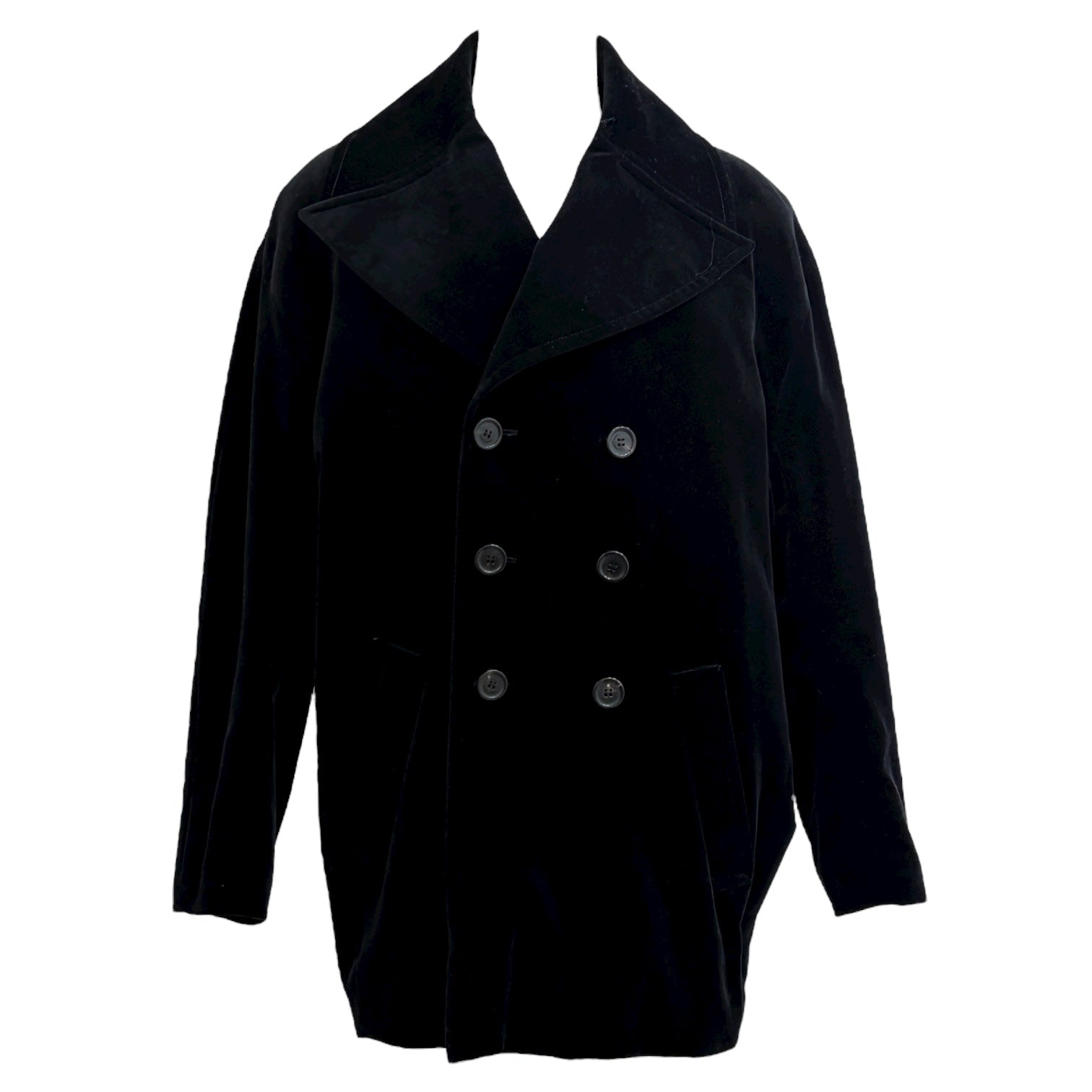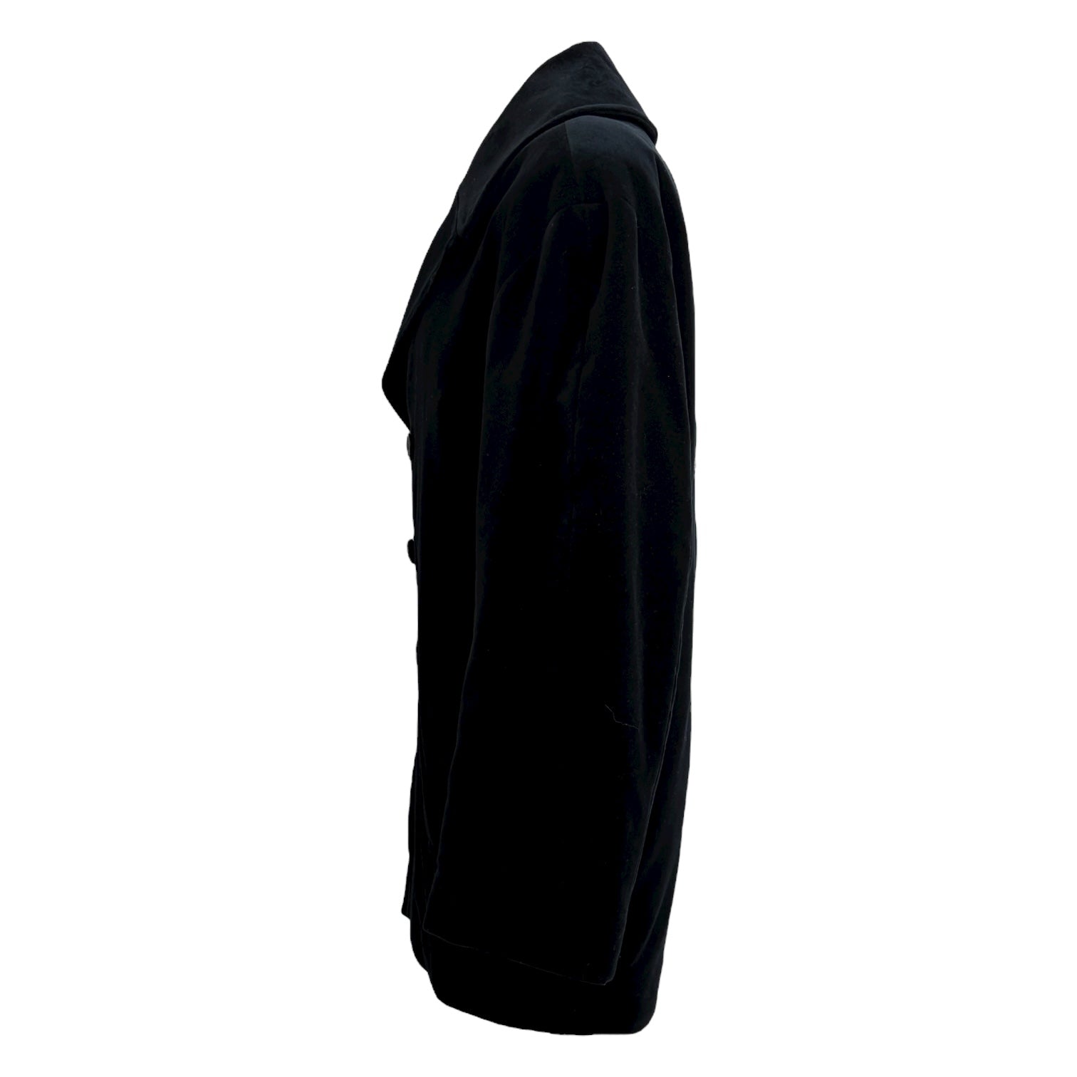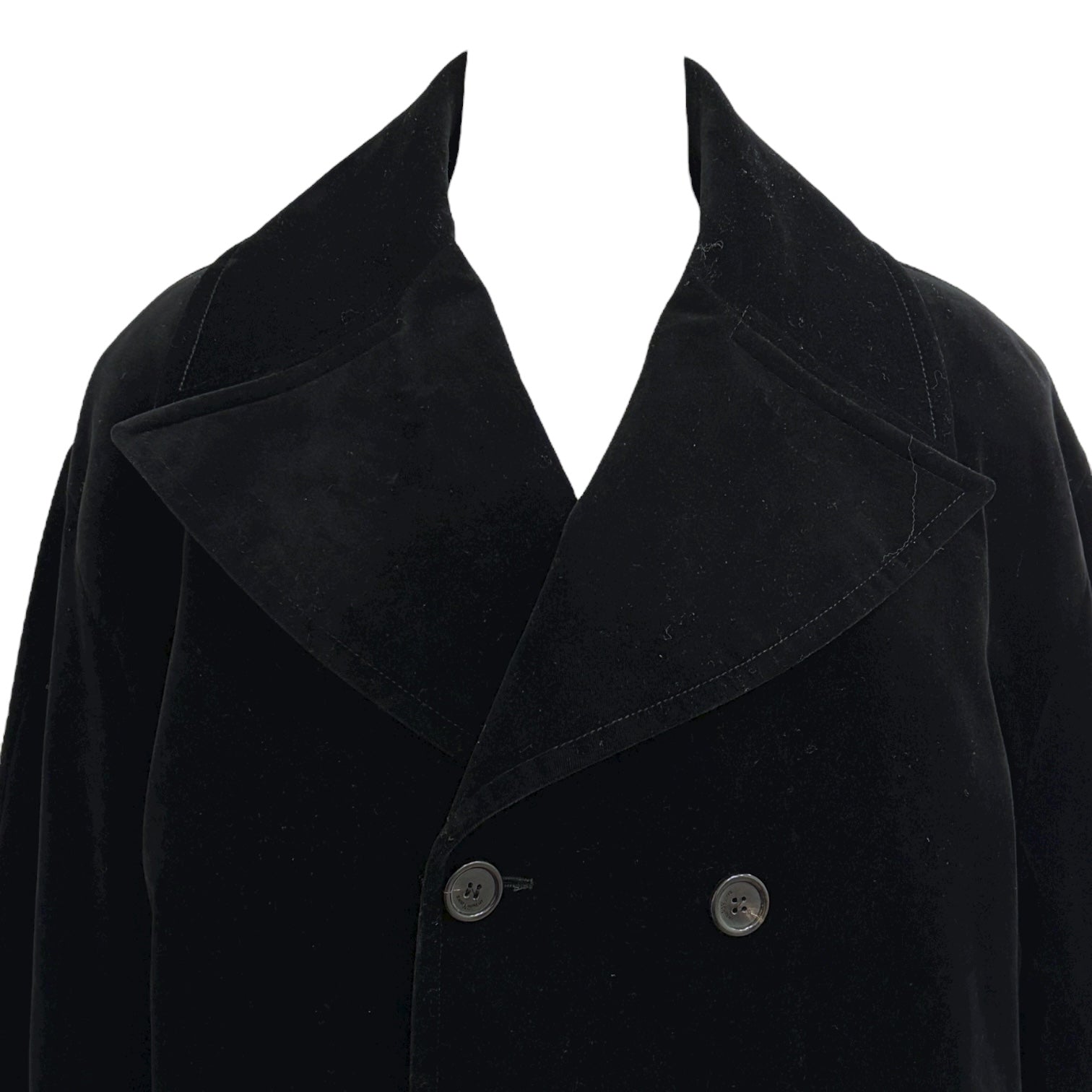 A striking Saint Laurent black velvet coat featuring a classic double-breasted silhouette and oversized lapels. The back showcases a bold crystal-embellished YSL logo, adding a touch of signature glamour. Crafted in luxurious velvet, this coat embodies timeless Parisian sophistication with a statement finish.