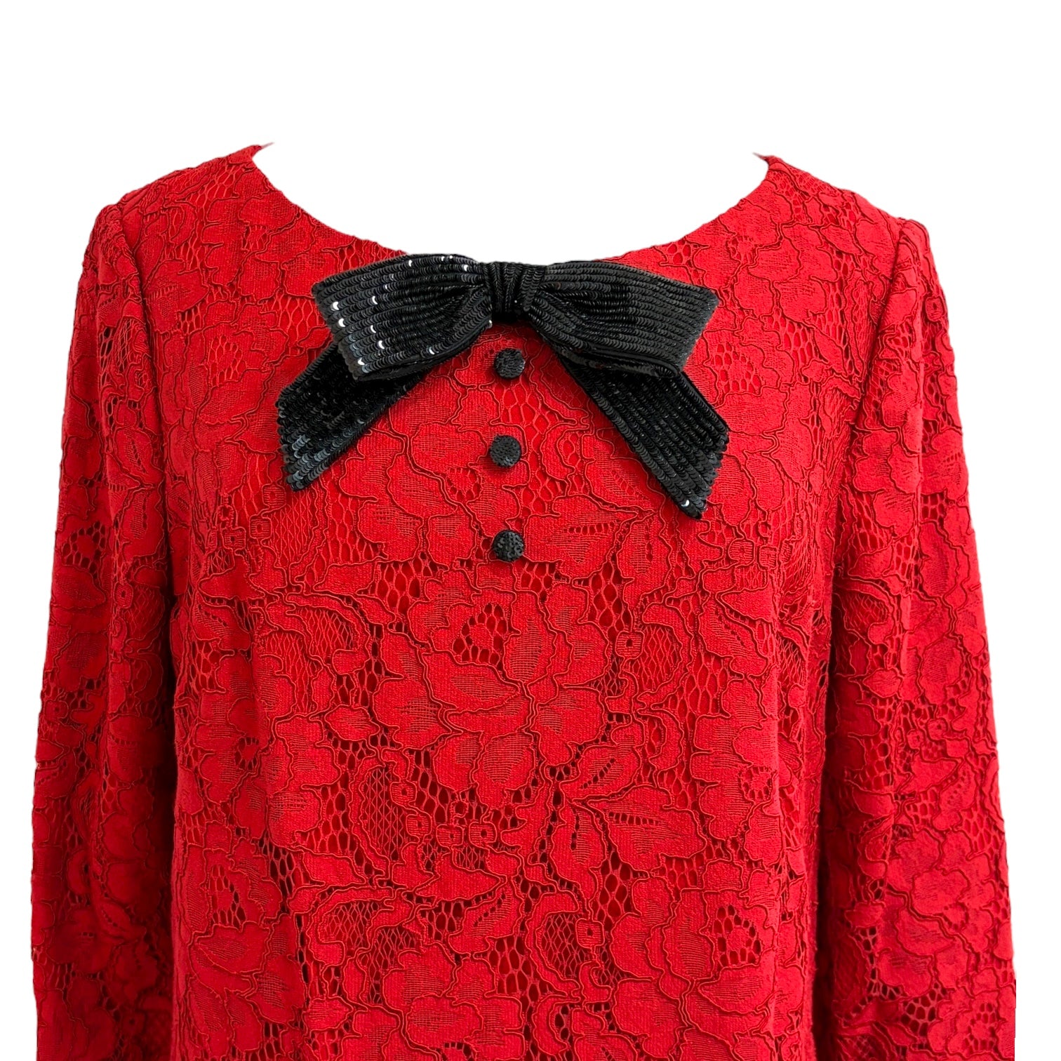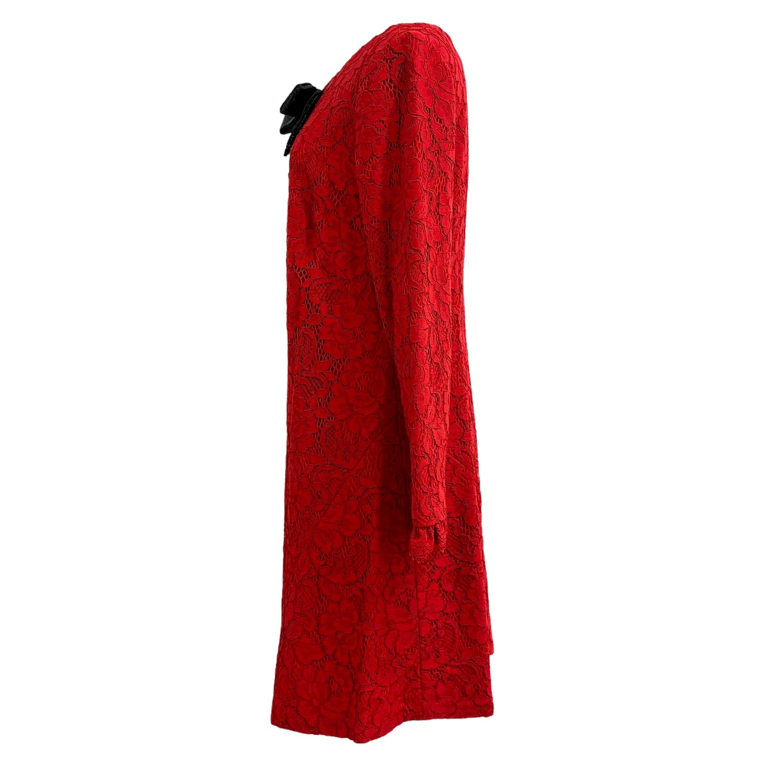 An exquisite Yves Saint Laurent red lace dress featuring delicate floral lace throughout and a refined A-line silhouette. The piece is elevated with a striking black velvet bow and button detailing at the neckline, embodying the brand’s signature fusion of Parisian romance and sophisticated femininity. A timeless and elegant choice for evening occasions or special events.